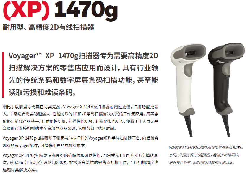 霍尼韋爾Voyager XP 1470 系列掃描儀可應(yīng)對繁忙銷售點掃描的苛刻要求——經(jīng)設(shè)計可承受從 1.8 米(6 英尺)高處的 30 次跌落和 0.5 米(1.6 英尺)范圍的 1,000 次滾動——同時提供比同類解決方案更高的精度。