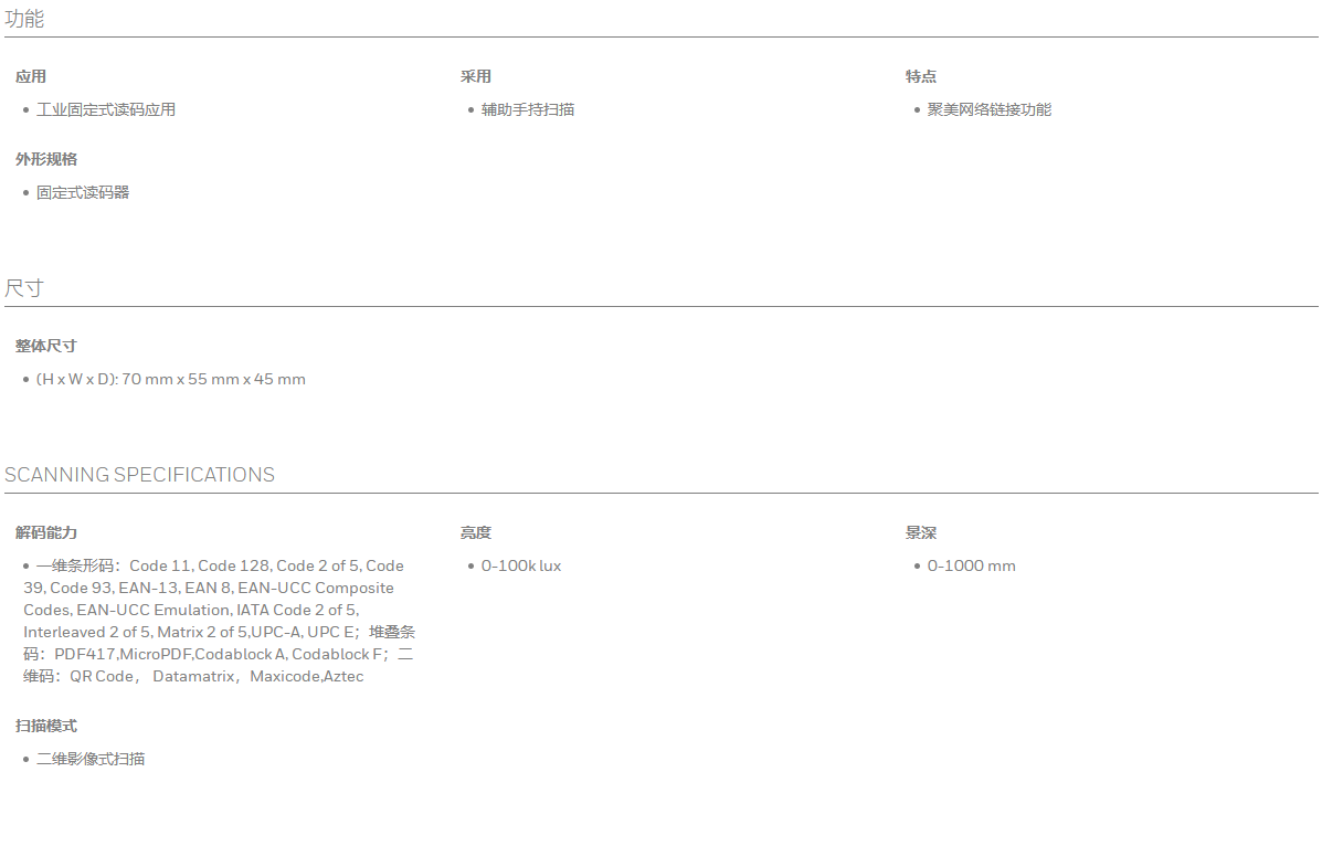 搭載200萬像素圖像傳感器,50萬/130萬像素掃描解碼輸出,采集幀率為100fps, 結合高速運算的處理芯片,再加上霍尼韋爾行業領先的解碼算法,極大地提高了產線數據采集效率