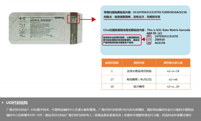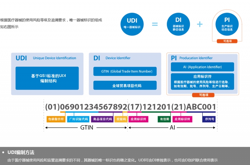 主要是一個由數字或字母組成的編碼。由器械識別碼(DI)和生產識別碼(PI)組成。