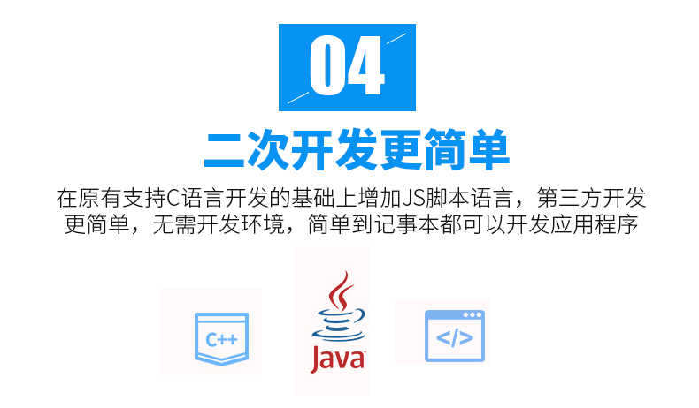 支持 JavaScript 腳本語言開發(fā),簡(jiǎn)單到用記事本都可以 開發(fā)應(yīng)用程序;支持 SQLite 數(shù)據(jù)庫,大大減少開發(fā)周期, 讓應(yīng)用開發(fā)者快速開發(fā)程序;同時(shí)也支持 C 語言開發(fā),讓應(yīng)用開發(fā)者有更多的選擇。