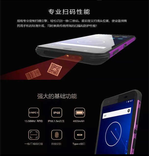 搭載專業定制掃描引擎,支持一維,二維條碼掃描。支持指紋識別功能,八核版本支持北斗/GPS/GLONASS (四核版本支持北斗/GPS), 標配 NFC功能。