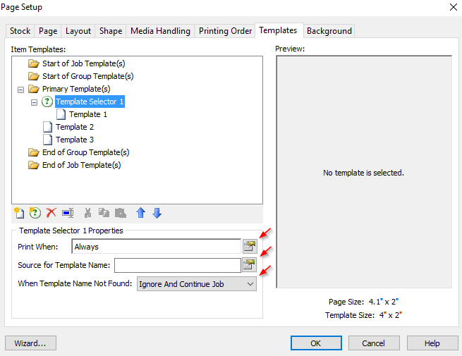 在“ 模板選擇器屬性” 部分中,指定包含要在“ 模板名稱源” 字段中打印的模板名稱的數(shù)據(jù)庫字段或數(shù)據(jù)源值。